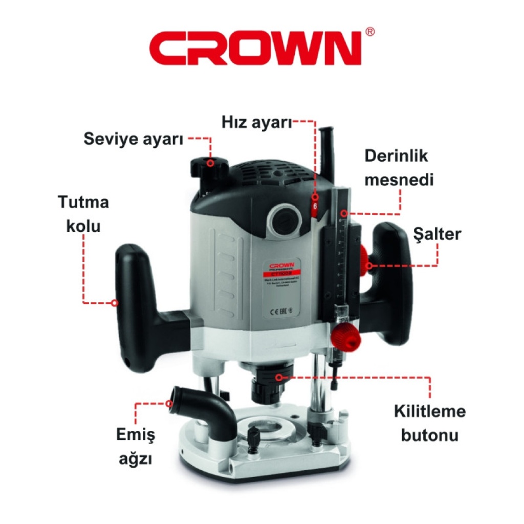 Crown CT11001 Freze, güçlü motoru ve hassas ayarları ile hem profesyonel hem hobi kullanıcıları için ideal bir freze çözümüdür. Ahşap işlerinizde yüksek performans ve güvenilirlik sunar.